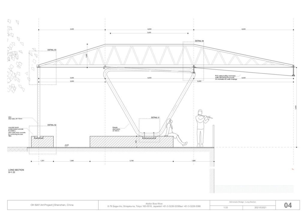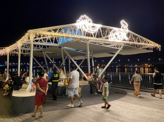 This tensile canopy provides shade and comfort for visitors, while its lightweight and transparent form enhances the openness of the riverside. Unlike traditional rigid roofing, the fabric structure creates a sense of flow and visual harmony with the bay. At night, illuminated by ambient light, it becomes a glowing landmark.