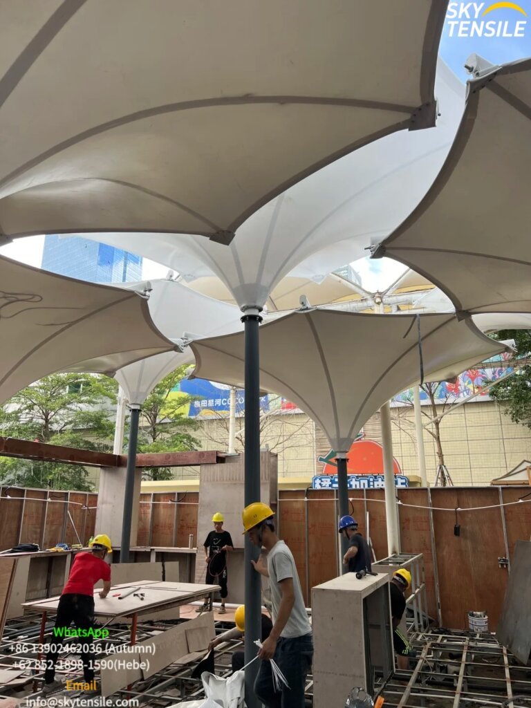 The canopy was designed using biomimetic principles, taking the “flower” as the core geometric concept. Throughout the design phase, the team conducted continuous shape simulation, structural analysis, and form-finding studies to ensure that the tensioned membrane surface achieved both visual elegance and structural stability.